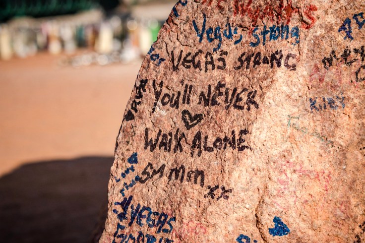 October 1, 2019 – I originally posted this blog on Medium nearly 2 years ago. Not long after the tragedy on October 1, 2017 an impromptu memorial began to build around the Welcome To Las Vegas sign. I was so moved by the memorial that I felt I needed to help memorialize it and pay tribute to the victims, first responders and visitors who paid tribute in their own way at the memorial. Below is what was originally posted and a link at the bottom of the post to all 58 photos I originally shared of the memorial
